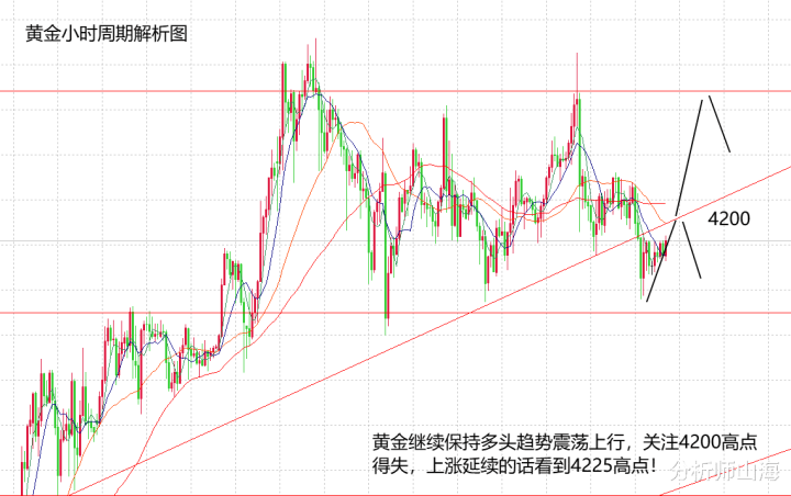 周一整体是先涨后跌,最高在4218,最低在4175,山海在看涨中实现了部分空间,可惜美盘消息面那一波下跌力度始料未及,导致周一坚持得多单被扫出局,在确定4175的双支撑效果后,山海继续给出做多的选择,目前多单获利持有中,继续看多头趋势的上涨空间。今天黄金继续上涨的话,上方关注4230高点,下跌的话关注4175低点。从技术面来看,其实震荡的行情改变不是很大,不管是日线周期还是H4周期,其实都没有太大的技术改观,日线周期还是在中轨之上,是绝对的强势,只不过现在市场缺少上涨的动力,多头延续可能在本周美联储利率决议后发生,到时候再看日线强阳的发展情况。H4周期就是标准的震荡区间,布林收窄,均线粘合,周一的下跌看似要向下破位,但目前连阳的k线还是收高上涨,所以,区间震荡明显,只要区间不破,就不必过分看多空的破位性行情。那么,今天的行情就先看张后看跌,亚欧盘预计会直接上涨,4190激进可以做多,上方关注4230高点,不破就短线看,美盘可能会此压制点回落,破位再看多头力度的延续性。